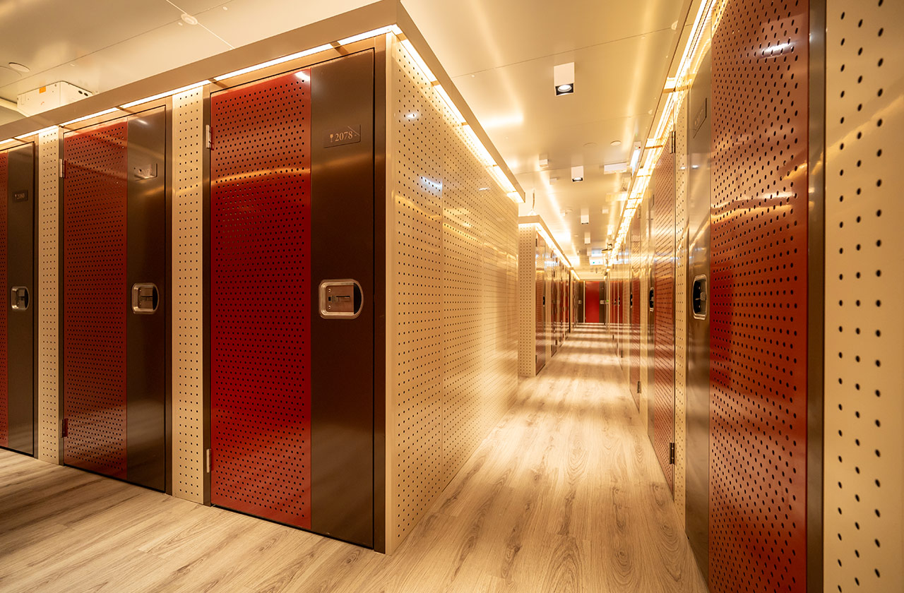 全港首創推拉式紅酒儲存櫃,設計時尚,同時方便客戶輕鬆拿取儲存櫃內的紅酒珍品。每個推拉式紅酒儲存櫃可以大約容納27箱紅酒。